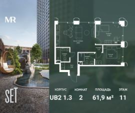 В ЖК SET продается 2-к квартира площадью 61.90 м², расположенная в корпусе 3, на 11 этаже 45 этажного дома.