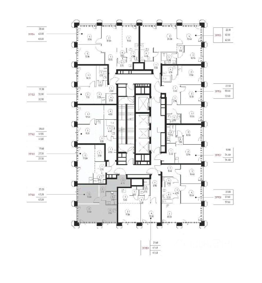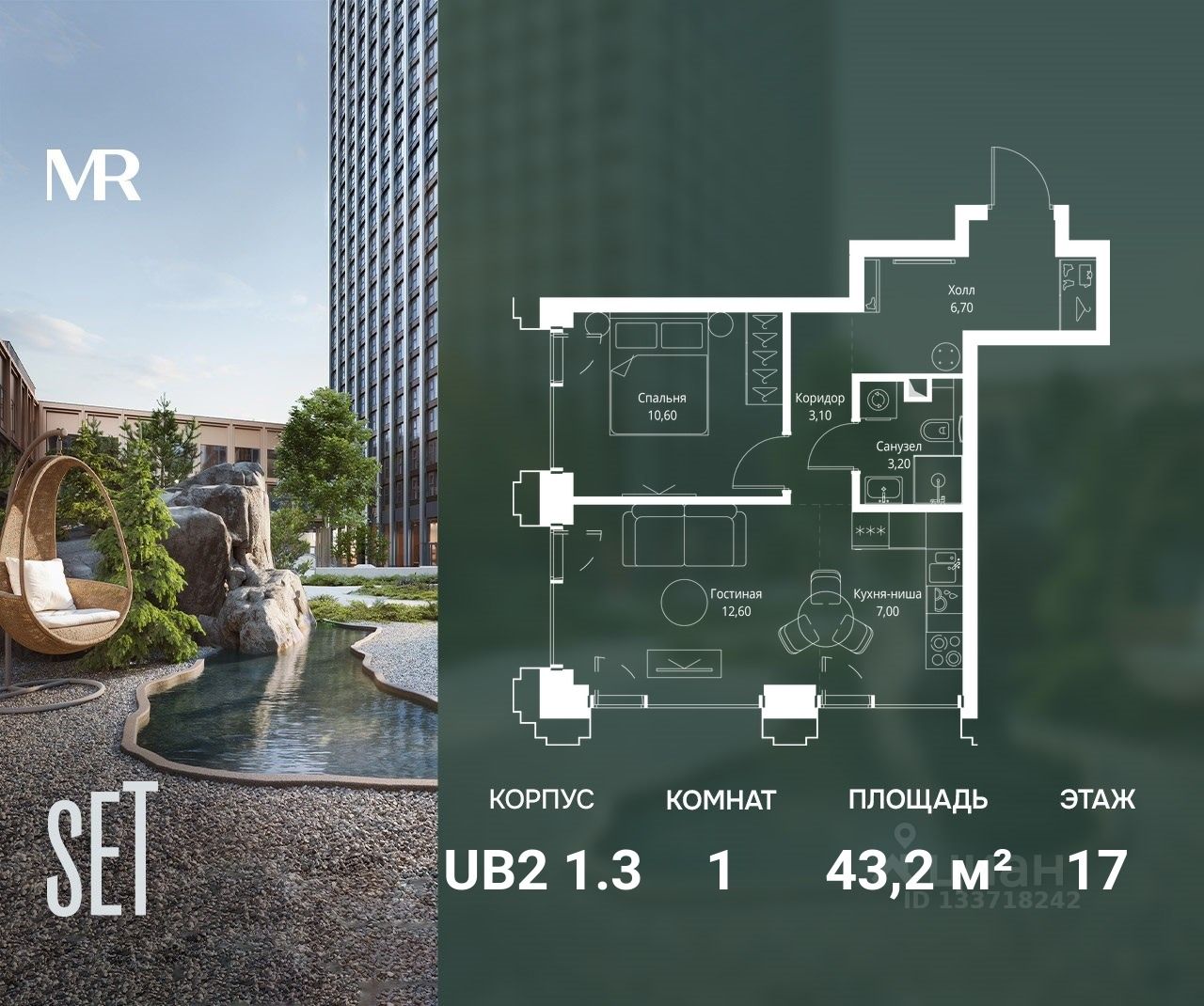 В ЖК SET продается 1-комнатная квартира площадью 43.20 м², расположенная в корпусе 3, на 17 этаже 45 этажного дома.