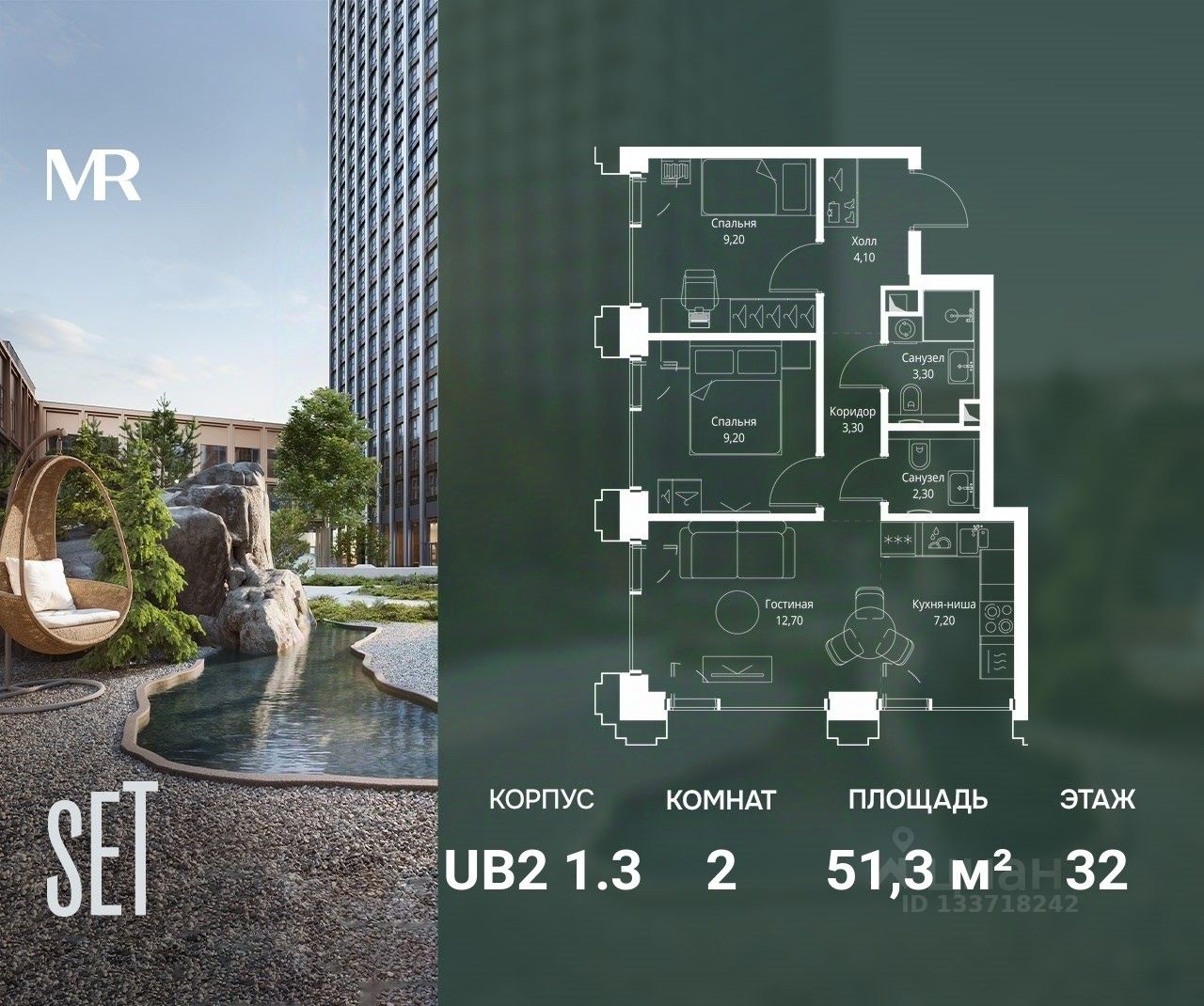 В ЖК SET продается 2-комнатная квартира площадью 51.30 м², расположенная в корпусе 3, на 32 этаже 45 этажного дома.