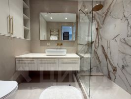 Совмещенный санузел с душевой, зеркало с подсветкой, полотенцесушитель, шкафчики.