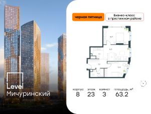 В жилом квартале, расположенном на границе с природным заказником "Долина реки Очаковки", продаётся 3-комнатная квартира площадью 63.20 кв.м без отделки. Квартира расположена на 23 этаже 48-этажного корпуса Корпус 8 в жилом комплексе бизнес-класса Level Мичуринский (компания Level Group/Левел групп).