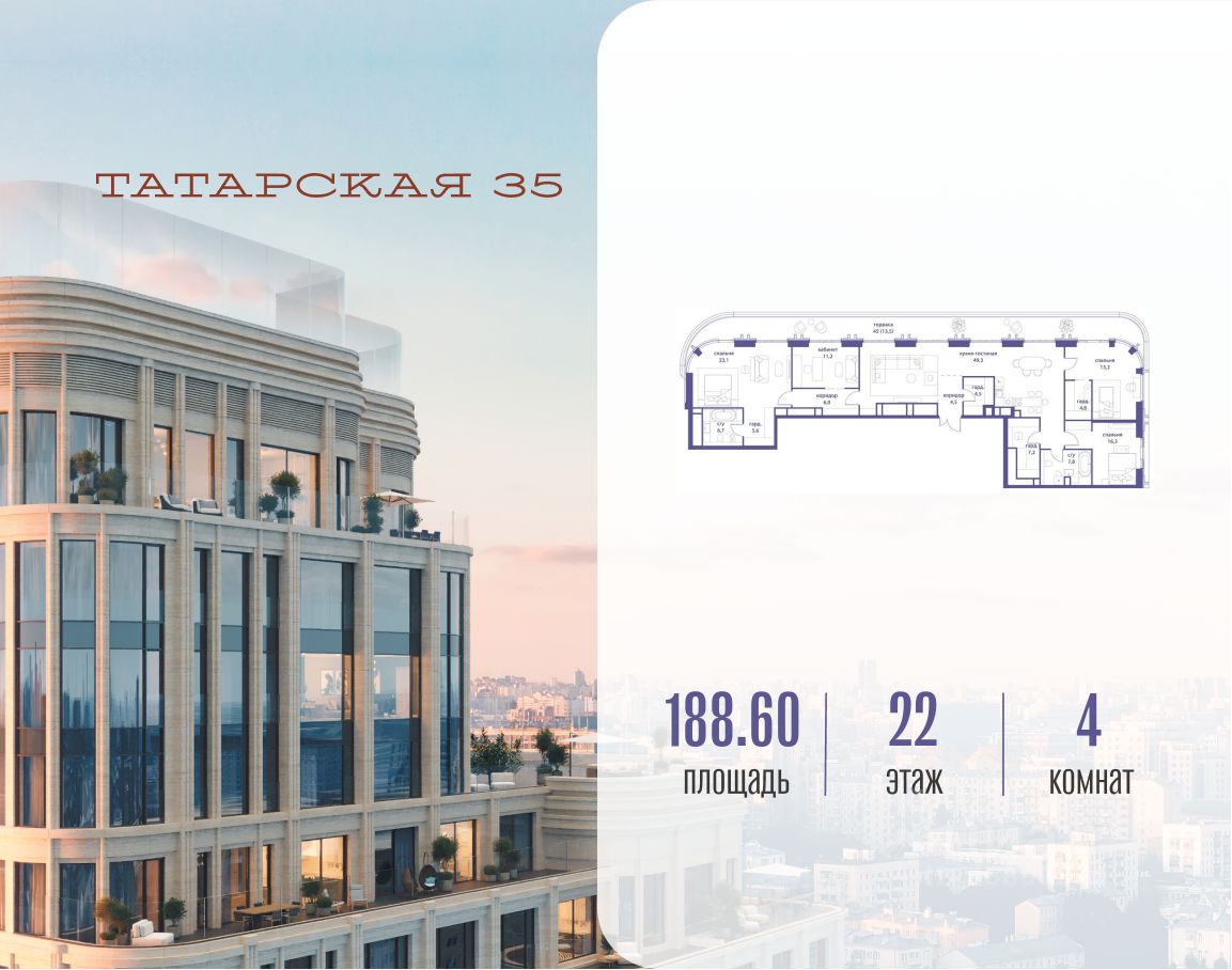 ТАТАРСКАЯ, 35 - новая архитектурная доминанта Замоскворечья, достопримечательность на фотопанорамах исторического центра Москвы. Элитный дом, созданный для тех, кто умеет смотреть далеко вперед, мыслить масштабно и воплощать собственный сценарий жизни.