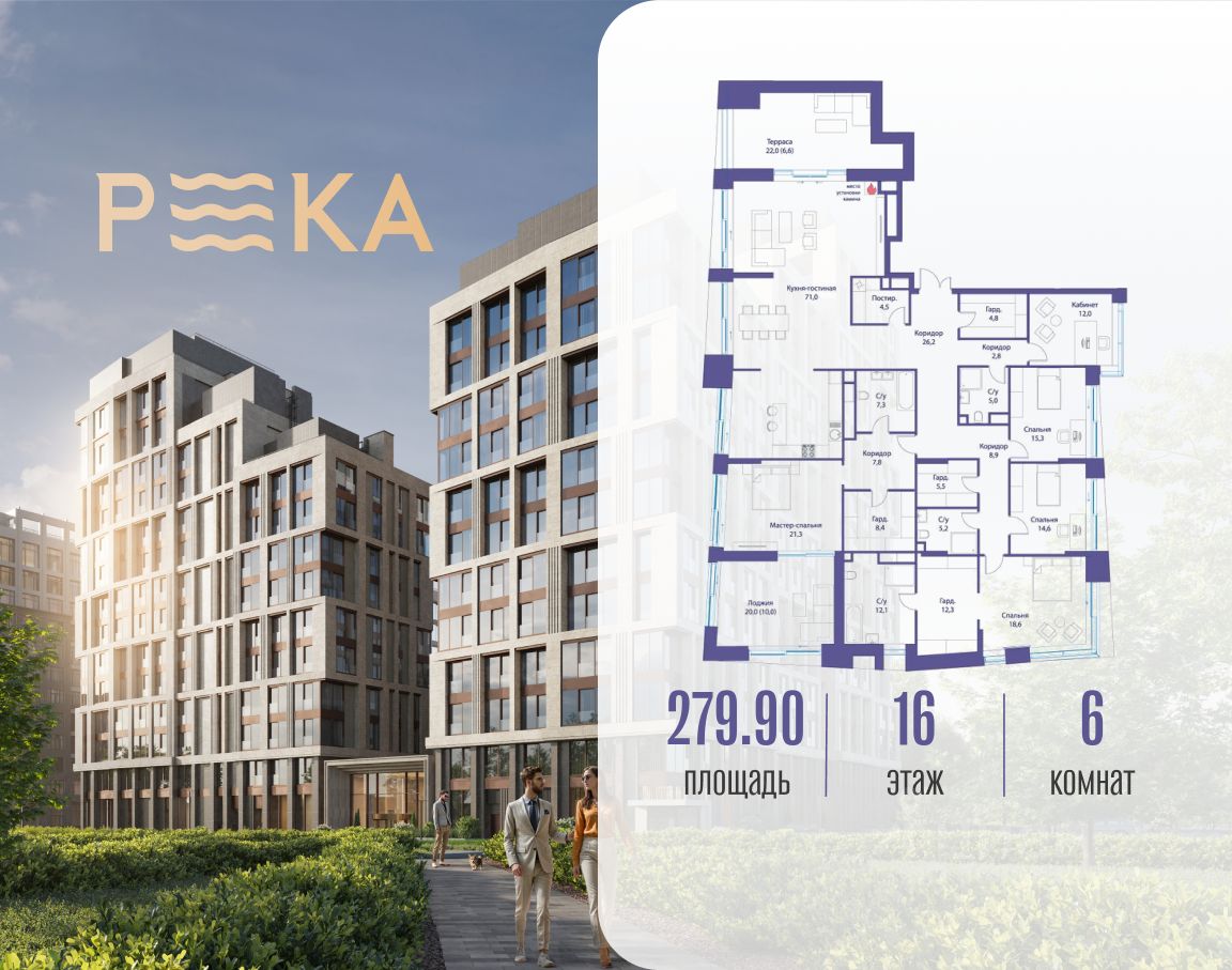 Продается просторная квартира площадью 279.90 м2 в жилом комплексе РЕКА. Квартира находится в 1 секции корпуса 3 (будет введен в эксплуатацию в 4 кв. 2026). Этаж 16-й из 16.