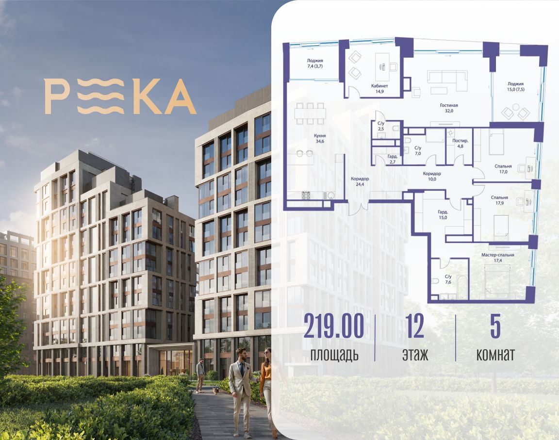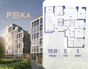 Продается просторная квартира площадью 219.00 м2 в жилом комплексе РЕКА. Квартира находится в 4 секции корпуса 3 (будет введен в эксплуатацию в 4 кв. 2026). Этаж 12-й из 14.
