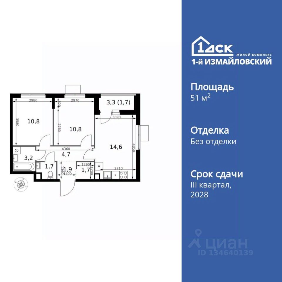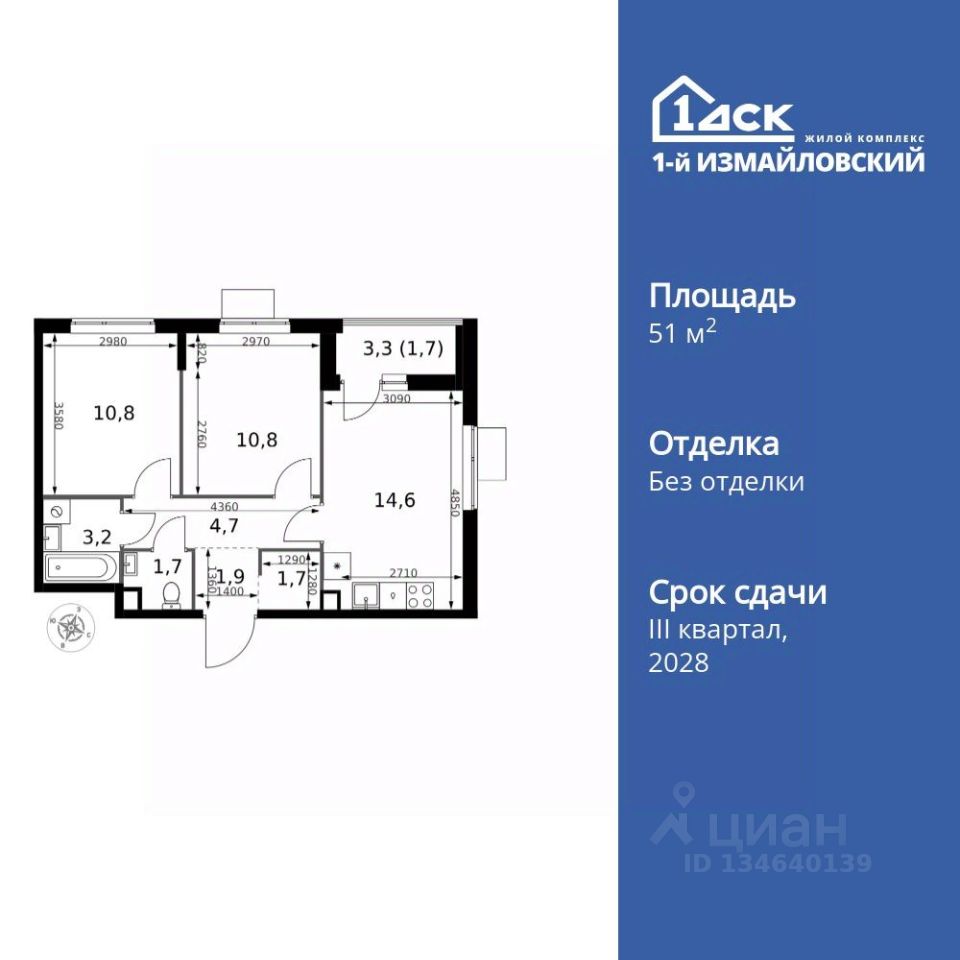 Продаётся 2-к квартира номер 1134 общей площадью 51.1 кв.м. на 25-м этаже 25 этажного здания. Без отделки. Цена с учётом скидки.