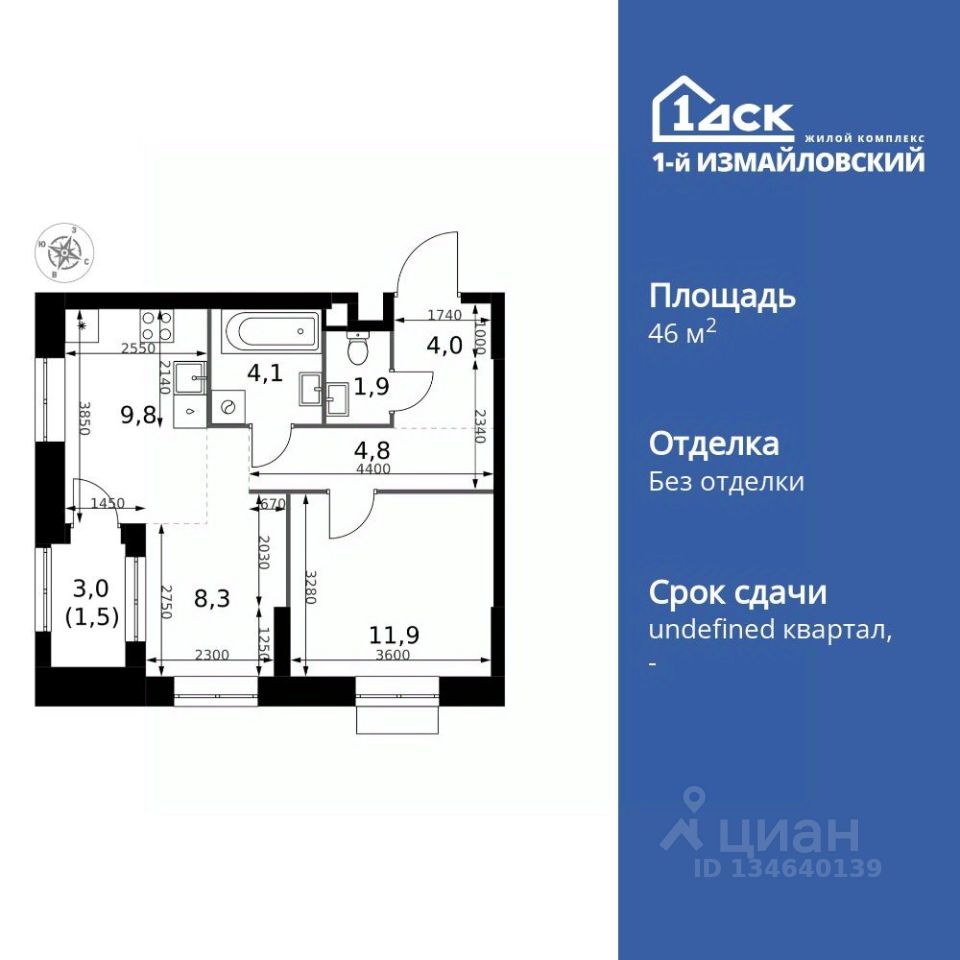 Продаётся 2-к квартира номер 455 общей площадью 46.3 кв.м. на 4-м этаже 32 этажного дома. Без отделки.