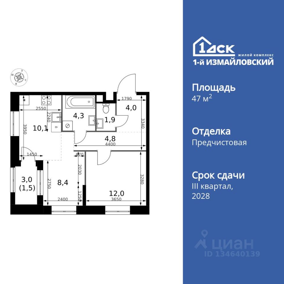 Продаётся 2-к квартира номер 545 общей площадью 47 кв.м. на 10-м этаже 32 этажного здания. Отделка Whitebox.