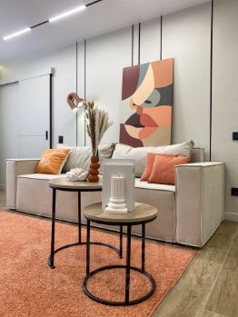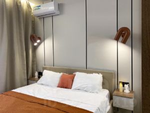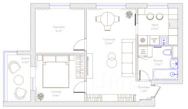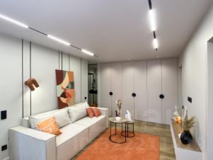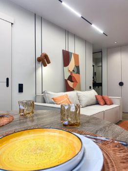 В квартире по плану: две спальные комнаты, в одной из комнат большой застекленный балкон, кухня-гостиная с возможностью зонировать гостиную от кухни раздвижной дверью. Шкафы в гостиной и спальне решают вопрос дефицита мест хранения. Вся встроенная мебель изготовлена по индивидуальному эскизу, на заказ. Кровать с ортопедическим матрасом и подъемным механизмом. В гостиной - раскладной диван. Стол в обеденной зоне также имеет раскладной механизм. На кухне есть 2 дополнительных места для приема пищи в суетливое утреннее время. Для выполнения ремонта использованы дорогие отделочные материалы, плитка из керамогранита в ванной, премиальный кварцвинил английская елка на полу в гостиной, комнатах и кухни, которому не страшен даже потоп. Пол в ванной с подогревом.
