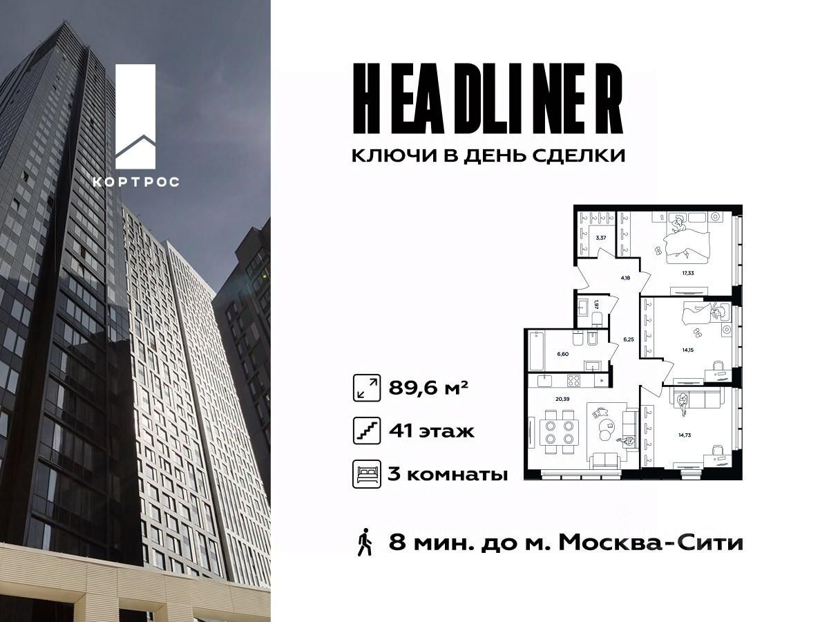 Продаётся 3-комнатная квартира евроформата в ЖК HEADLINER, общей площадью 89,6 кв. м, на 41 этаже. Высота потолков 3 м. Это просторная, светлая квартира евроформата подойдет для большой семьи, в ней три полноценные спальни и кухня-гостиная. В квартире предусмотрено 2 санузла. Окна в квартире выходят на разные стороны, в том числе на панораму Москвы-Сити и центра столицы. Квартира продается без отделки. Дом сдан.