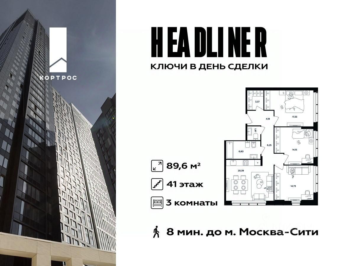 Продаётся 3-комнатная квартира евроформата в ЖК HEADLINER, общей площадью 89,6 кв. м, на 41 этаже. Высота потолков 3 м. Это просторная, светлая квартира евроформата подойдет для большой семьи, в ней три полноценные спальни и кухня-гостиная. В квартире предусмотрено 2 санузла. Окна в квартире выходят на разные стороны, в том числе на панораму Москвы-Сити и центра столицы. Квартира продается без отделки. Дом сдан. Квартал HEADLINER находится в Пресненском районе ЦАО, рядом с м. "Шелепиха". В непосредственной близости Москва-Сити. Рядом находятся парк Причальный и Шелепихинская набережная. За 5-10 минут на автомобиле можно добраться до парков Фили, Красногвардейские пруды, Красная Пресня и парка Победы. В пешей досягаемости - ТРЦ "Афимолл Сити", ТРЦ "Филион", ТРЦ "Европейский", World Class, а также вся инфраструктура ММДЦ "Москва-Сити". На территории ЖК расположен филиал частной аккредитованной школы полного дня "Путь к успеху". В непосредственной близости расположены лучшие школы ЦАО: ГБОУ "Романовская школа", физико-математическая школа 56 им. академика В.А. Легасова, школа с углубленным изучением английского языка 1232 "На Кутузовском". Особенности ЖК: - Потрясающие видовые характеристики открываются на "Москва-Сити", Москву-реку и панораму центра столицы; - 8 минут пути до набережной Тараса Шевченко с живописными видами на Headliner и Деловой центр; - Разная высота корпусов: от 5 до 51 этажа с уникальным внешним видом; - Потолки от 3 м; - Доступны варианты как с отделкой white box, так и без нее; - 80% квартир имеют ширкоформатные окна; - Вместительный двухуровневый подземный паркинг с кладовыми; - Лаунж-зоны с каминами и стильной мебелью; - Колясочные и гостевые уборные; - Концепция "дворы без автомобилей"; - Консьерж-зоны в подъездах; - Видеонаблюдение, круглосуточная охрана.