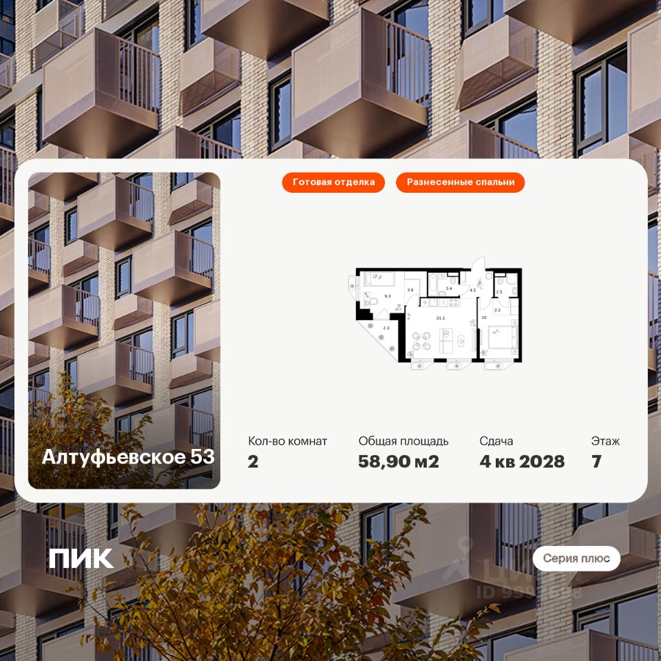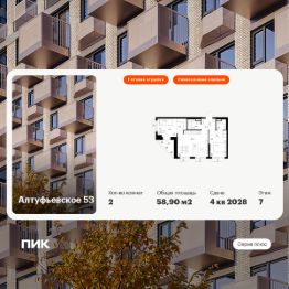 Продаётся 2-комн. квартира площадью 58,9 кв.м на 7 этаже 32 этажного дома (Корпус 1.1, Секция 2) проекта ПИК Алтуфьевское 53. Светлый просторный подъезд на уровне земли, функциональная планировка, большие окна, c отделкой.