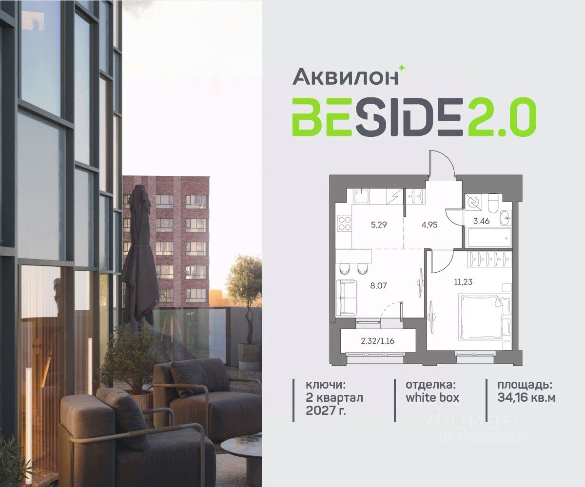 Продается уютная однокомнатная квартира на 11 этаже современного жилого комплекса Beside 2.0. Вид из окон: во двор. Срок сдачи: 2 кв. 2027 г.