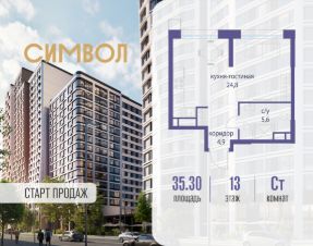 Продается квартира-студия от застройщика: общая площадь 35.30 м², жилая 10.00 м², кухня 14.80 м², 13-й этаж, жилой квартал "Гордость", корпус 36 (секция 4). Срок сдачи: 2 квартал 2029 года.