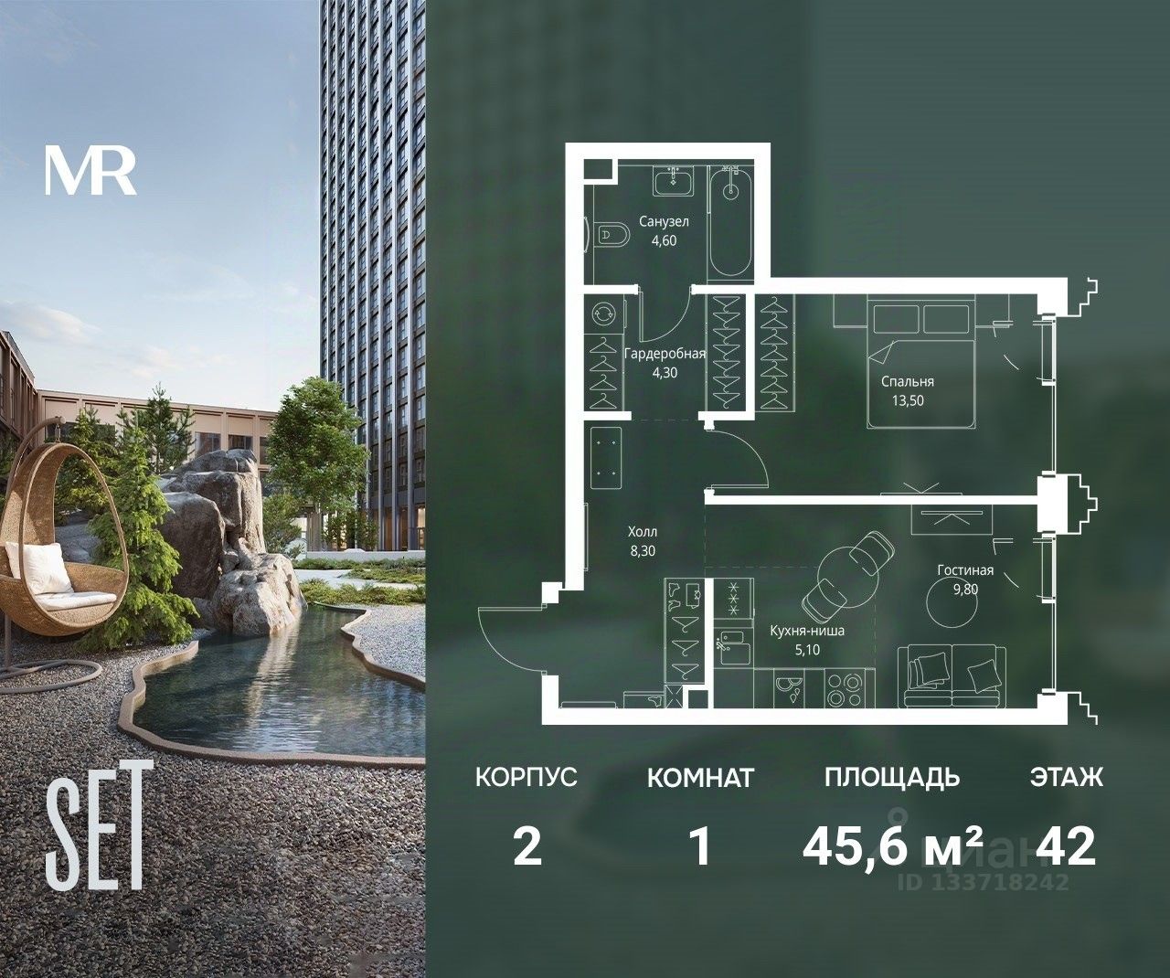 В ЖК SET продается 1-комнатная квартира площадью 45.60 м², расположенная в корпусе 2, на 42 этаже 59 этажного дома.