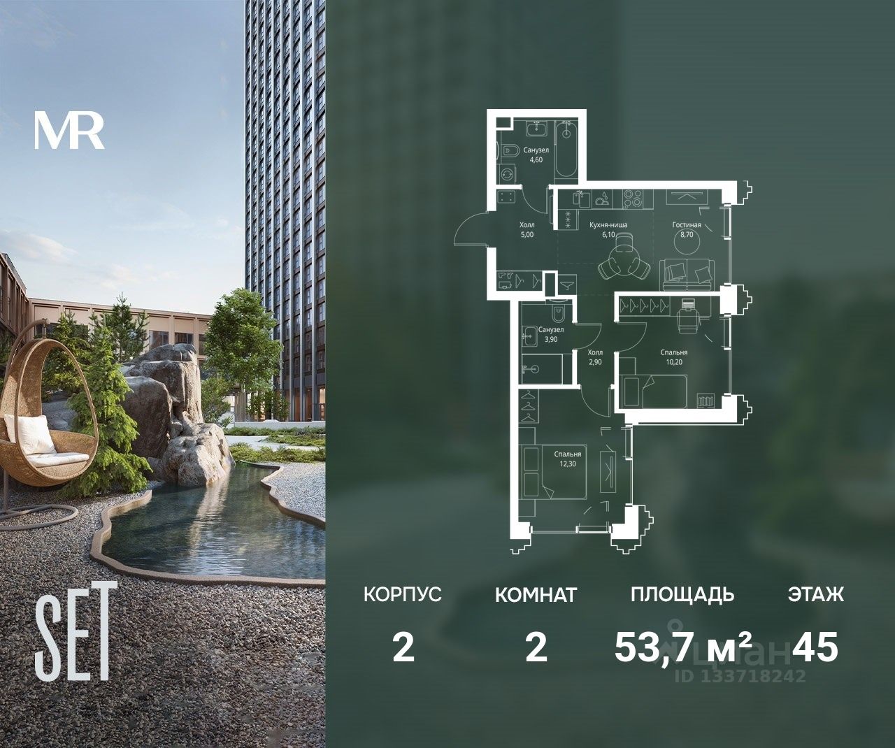 В ЖК SET продается 2-комнатная квартира площадью 53.70 м², расположенная в корпусе 2, на 45 этаже 59 этажного дома.