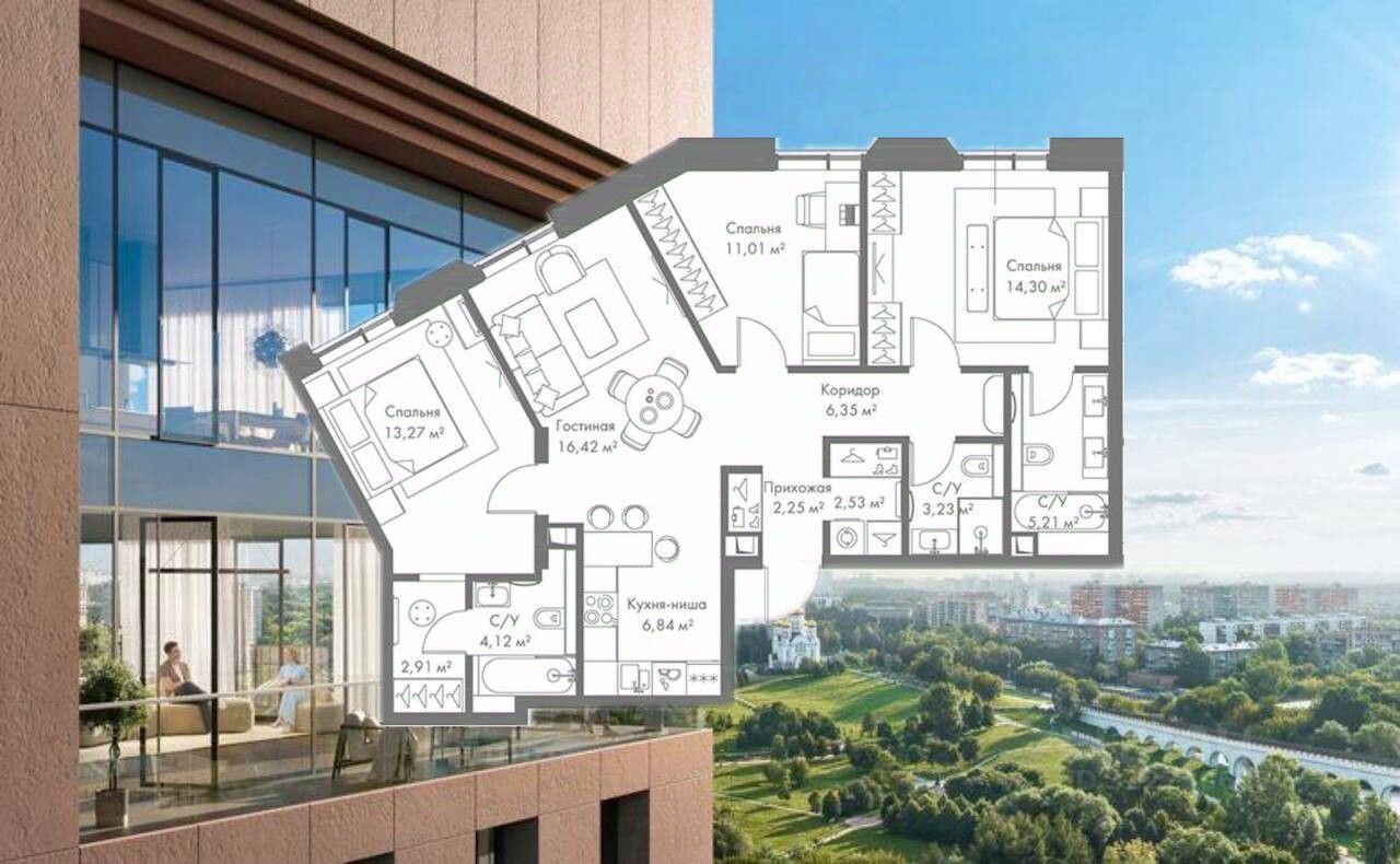 Площадь квартиры 88.4 м, кухня-гостиная 23.3 м