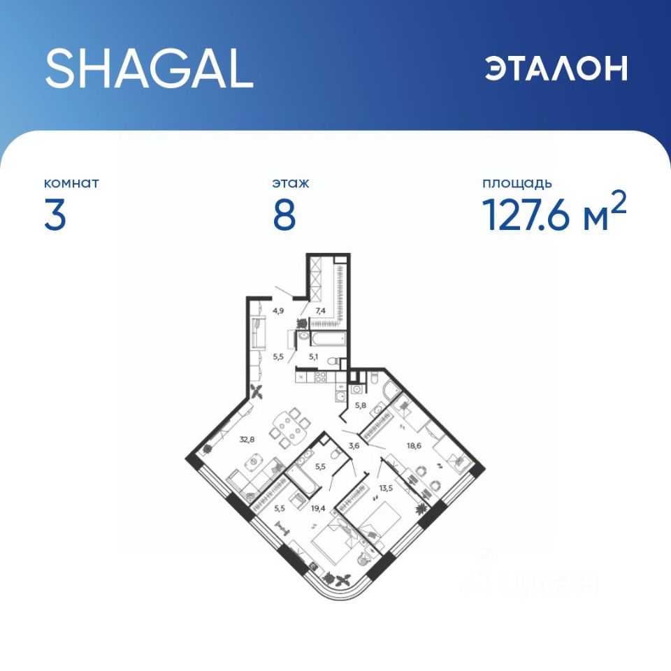 Продается квартира 46, по адресу Москва, внутригородская территория, муниципальный округ Даниловский, набережная Марка Шагала, земельный участок 15, корпус Жилой квартал Shagal, 2 очередь, 1 этап, корпус 4 в Shagal на 8 этаже, с площадью 127.6 м2.