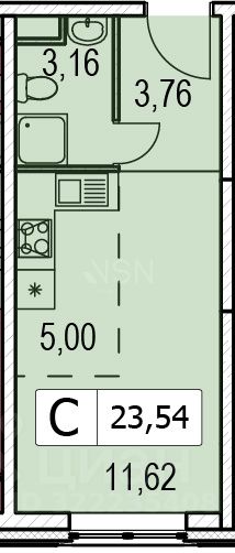 Квартира общей площадью 23,54 м², без отделки, что позволит создать дизайнерский ремонт по Вашему вкусу.