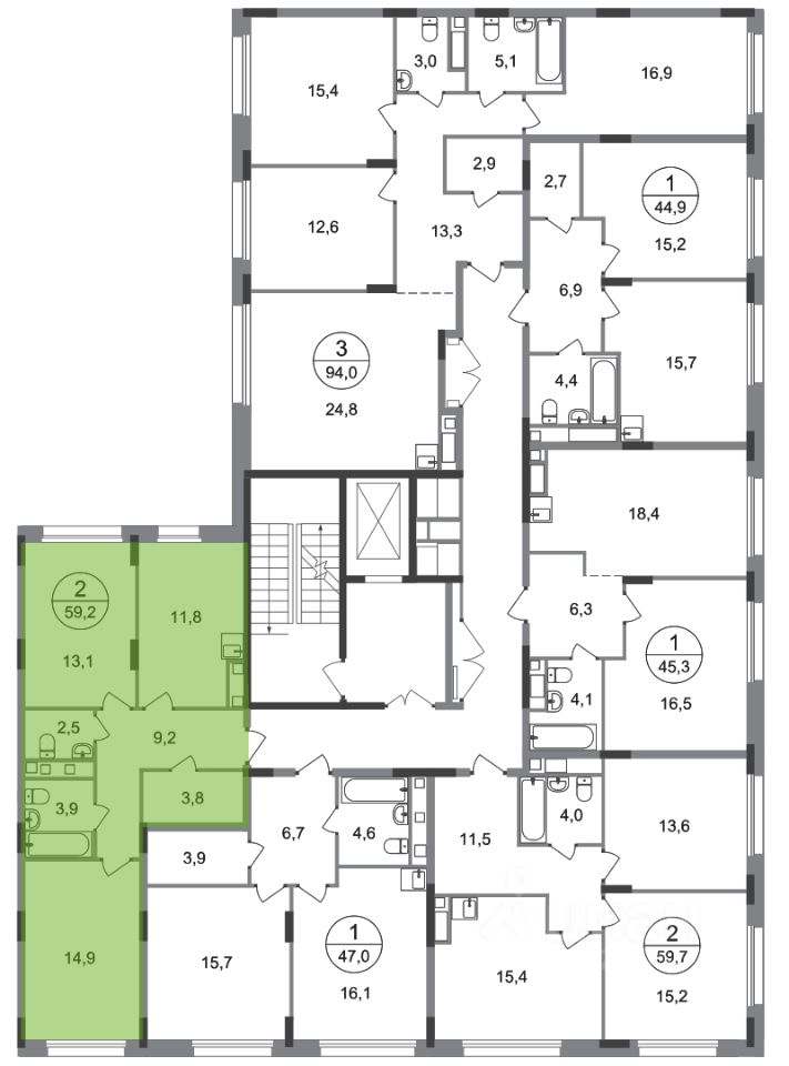 Общая площадь квартиры - 59,2 кв. м, этаж 7 из 17.