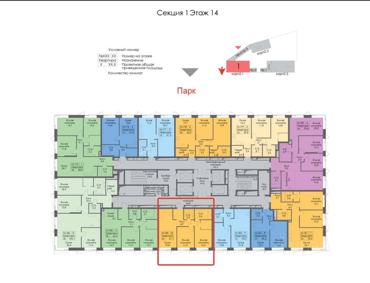 Продаю 2-к квартиру 61.1 м² номер 148 на 14 этаже 31 этажного дома корпус 2.1 .в Moments (FORMA). Вид на парк! Свободная планировка.