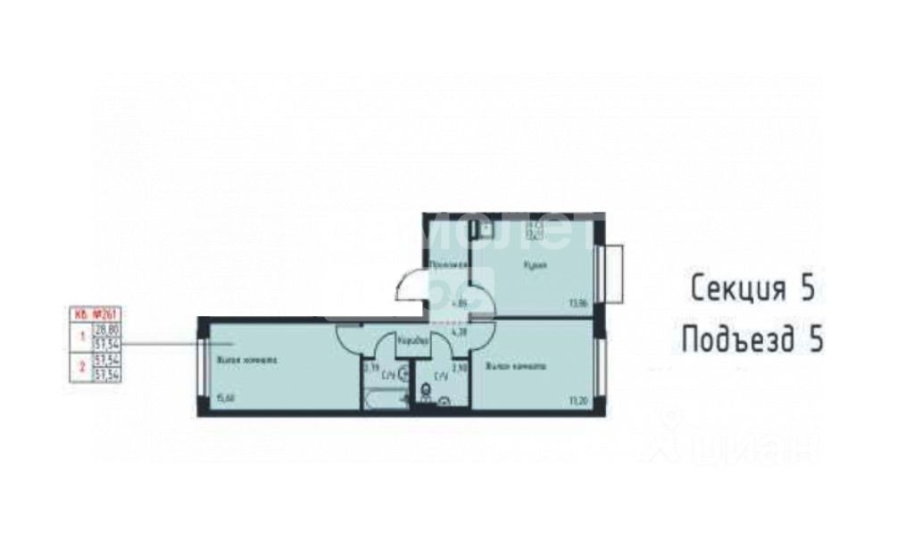 Общая плoщадь 57,54 м², жилaя плoщадь 28,80 м², кухня 13.86 м², 2 изолированные комнаты 13.20 м² и 15.60 м², прихожая 4.89 м², коридор 4.30 м², санузел раздельный.
