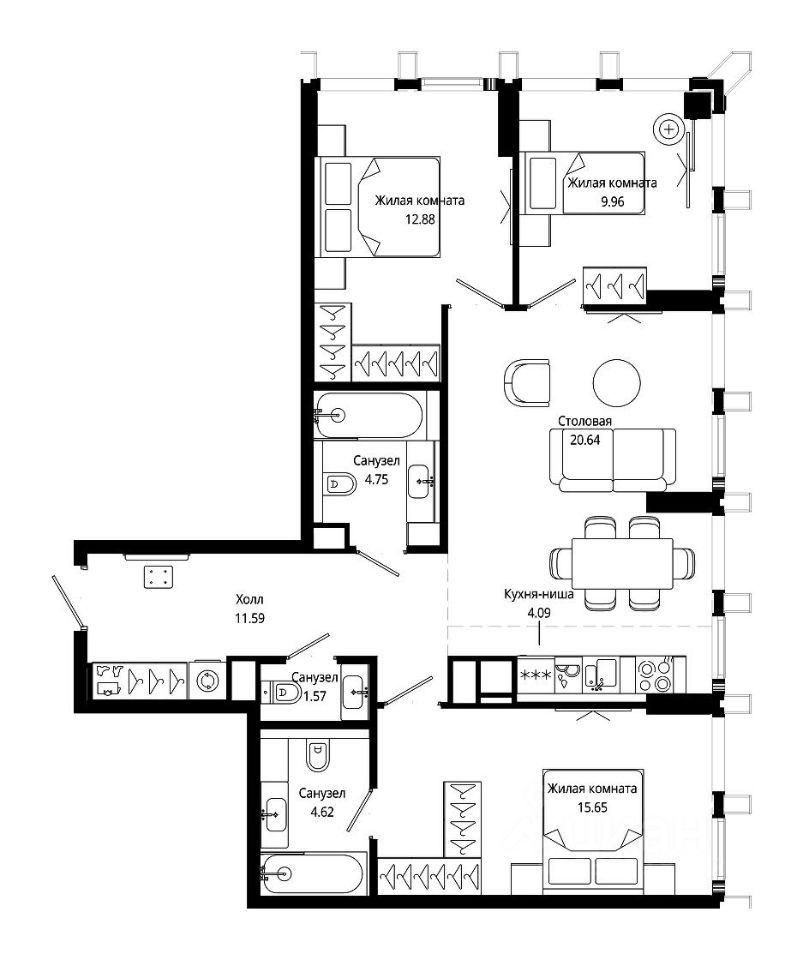 Продается 3-комнатная квартира общей площадью 85.75 м² с предчистовой отделкой в ЖК премиум-класса Mod на 17-м этаже 44 этажного дома.