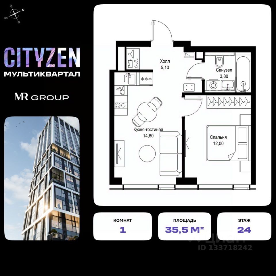 Продается 1-к квартира от застройщика в жилом мультиквартале CITYZEN на 24-м этаже в корпусе #6 урбан-блока VOLNA. Общая площадь лота составляет 35.50 м²