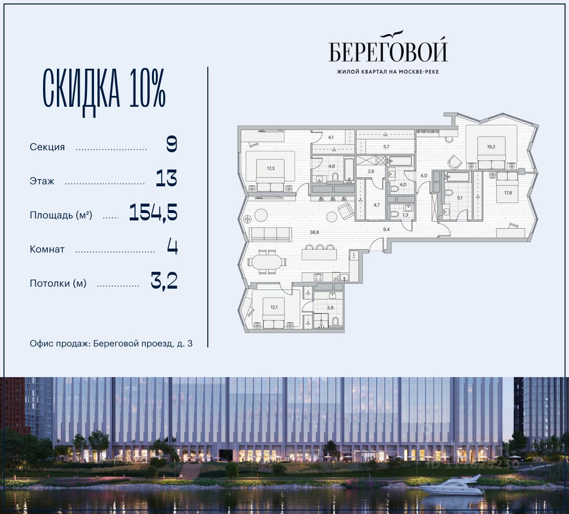 Река. Парк. Сити. Готовый дом в идеальном месте. Продается 4-комнатная квартира на 13 этаже с панорамным остеклением и видом на Береговой пр-д.