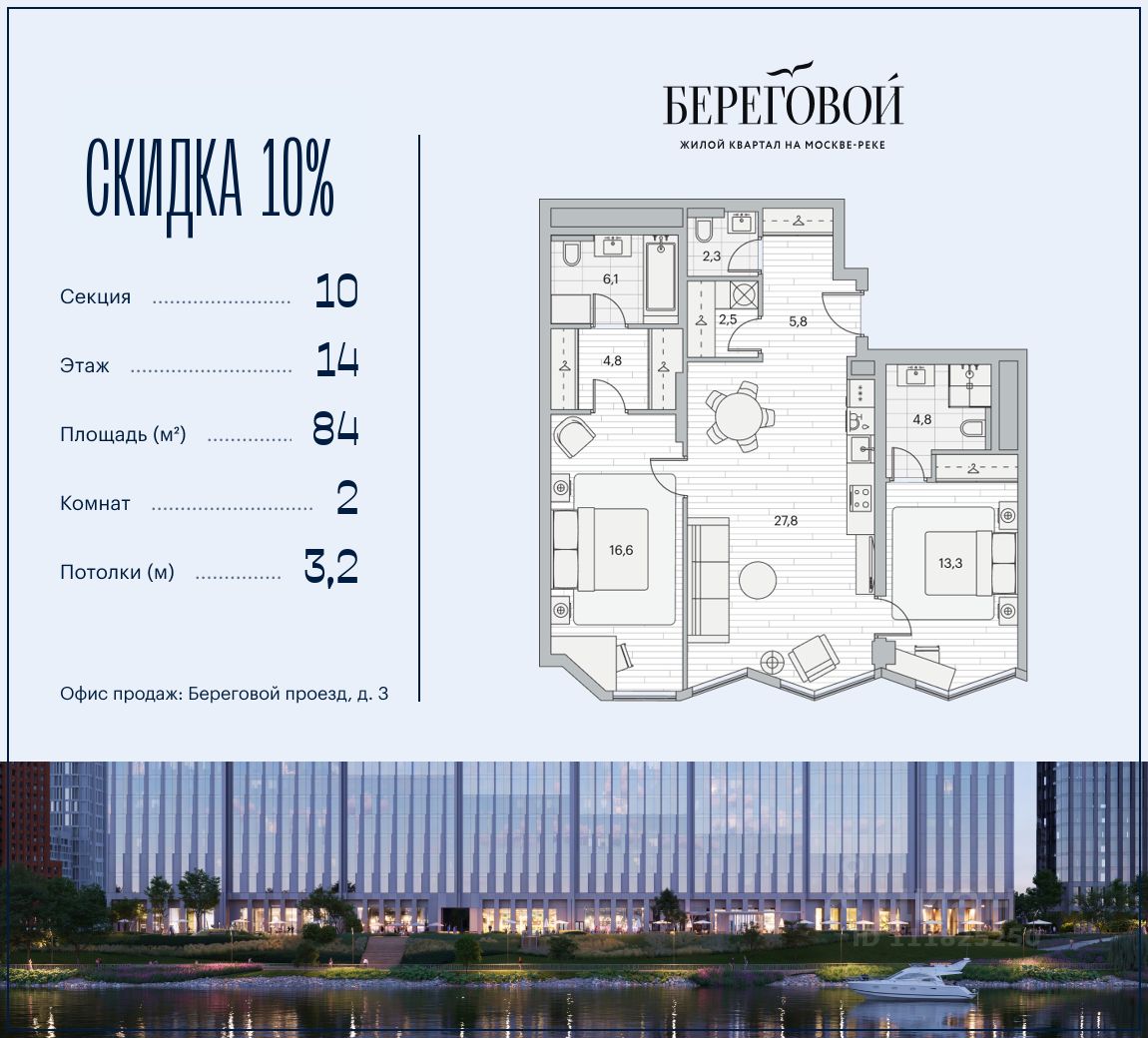 Река. Парк. Сити. Готовый дом в идеальном месте. Продается 2-комнатная квартира на 14 этаже с панорамным остеклением и видом на Береговой пр-д.