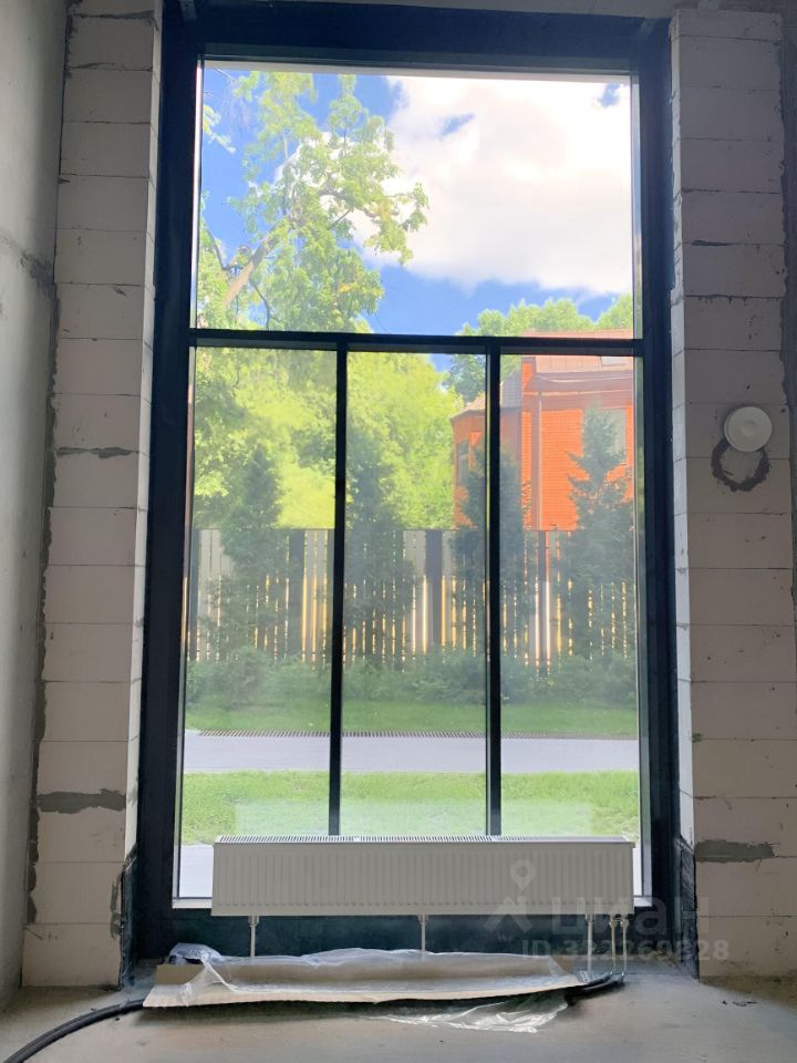 Панорамные три окна в пол с прекрасным видом на внутреннюю часть огороженной территории с ландшафтным дизайном.
