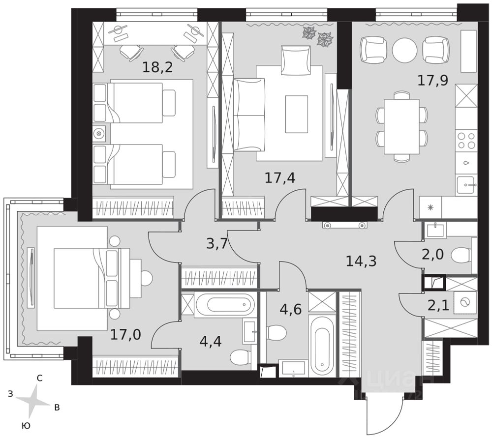 Продаётся 3-к квартира номер 504 общей площадью 101.6 кв.м. на 14-м этаже 28 этажного дома. Отделка Whitebox. Цена с учётом скидки!