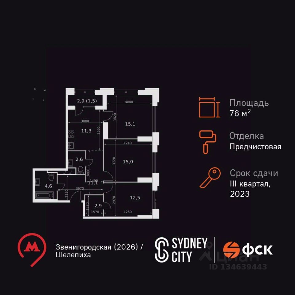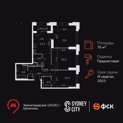 Продаётся 3-к квартира номер 6 общей площадью 76.6 кв.м. на 2-м этаже 43 этажного здания. Отделка Whitebox. Цена с учётом скидки.