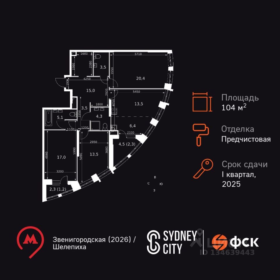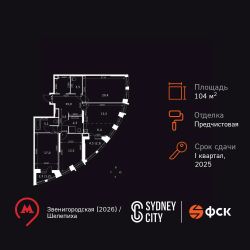 Продаётся 4-к квартира номер 425 общей площадью 104.8 кв.м. на 24-м этаже 44 этажного здания. Отделка Whitebox. Цена с учётом скидки.