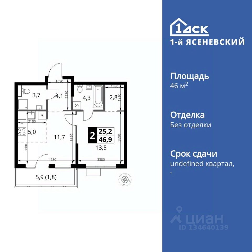 Продаётся 2-к квартира номер 1044 общей площадью 46.9 кв.м. на 2-м этаже 6 этажного дома. Без отделки.