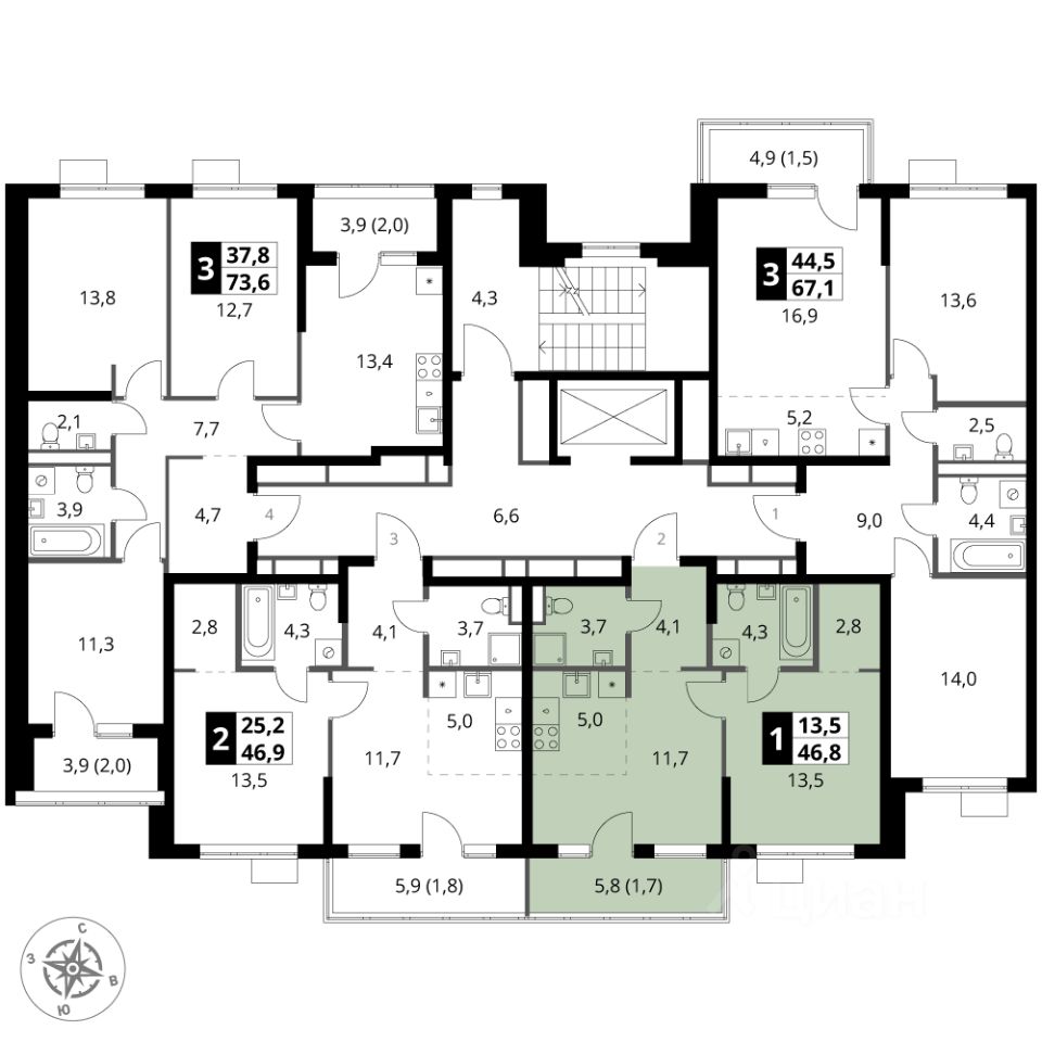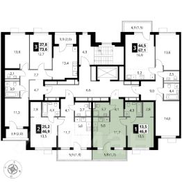 Продаётся 1-к квартира номер 1094 общей площадью 46.8 кв.м. на 2-м этаже 6 этажного дома. Без отделки.