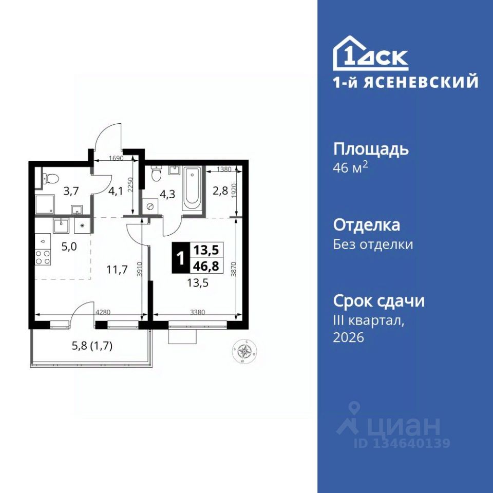 Продаётся 1-к квартира номер 1094 общей площадью 46.8 кв.м. на 2-м этаже 6 этажного здания. Без отделки.