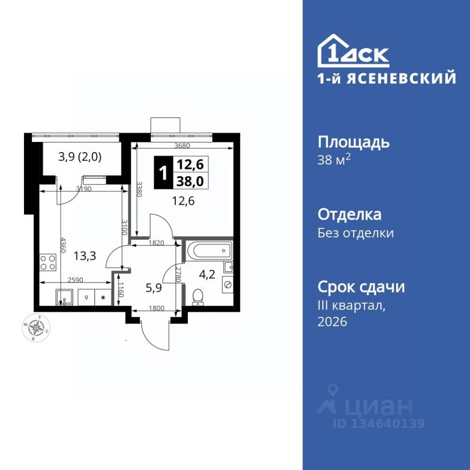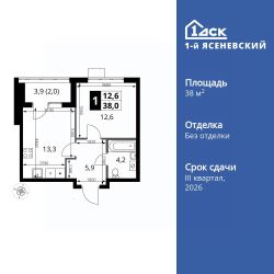 Продаётся 1-к квартира номер 1023 общей площадью 38 кв.м. на 17-м этаже 18 этажного здания. Без отделки.