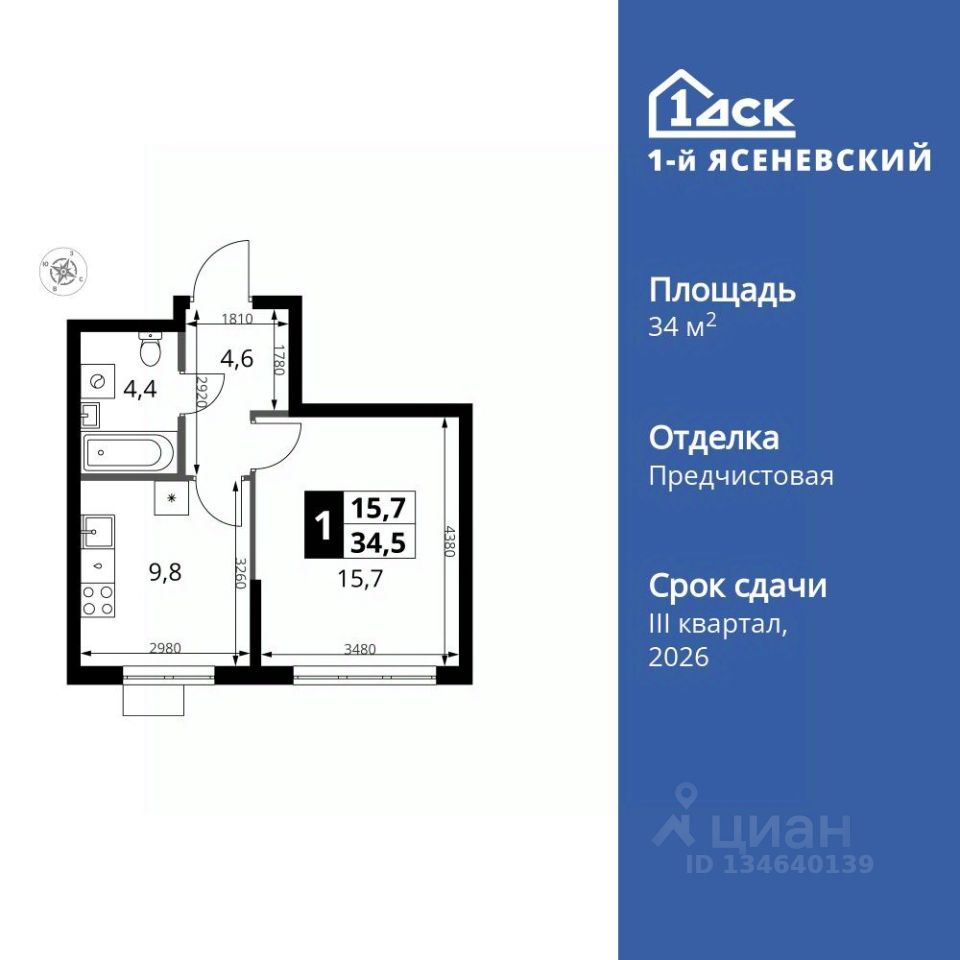 Продаётся 1-к квартира номер 543 общей площадью 34.5 кв.м. на 14-м этаже 18 этажного здания. Отделка Whitebox.