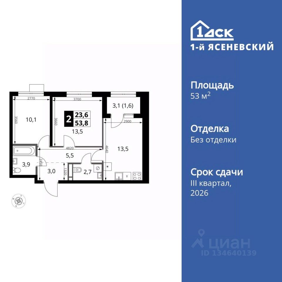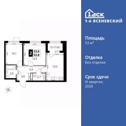Продаётся 2-к квартира номер 680 общей площадью 53.8 кв.м. на 10-м этаже 16 этажного здания. Без отделки. Цена с учётом скидки.
