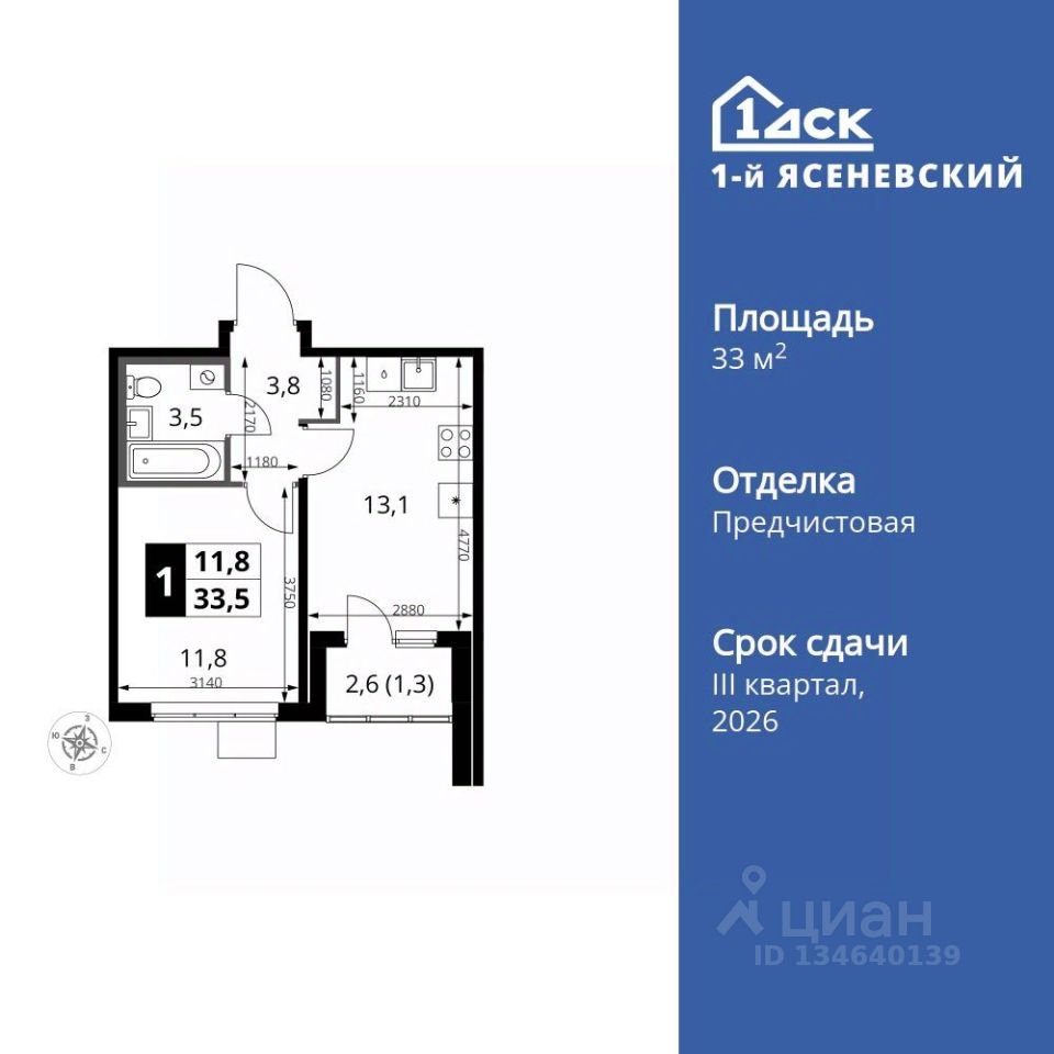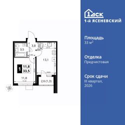Продаётся 1-к квартира номер 294 общей площадью 33.5 кв.м. на 15-м этаже 18 этажного здания. Отделка Whitebox.