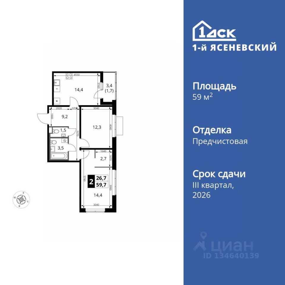 Продаётся 2-к квартира номер 595 общей площадью 59.7 кв.м. на 18-м этаже 18 этажного здания. Отделка Whitebox. Цена с учётом скидки.