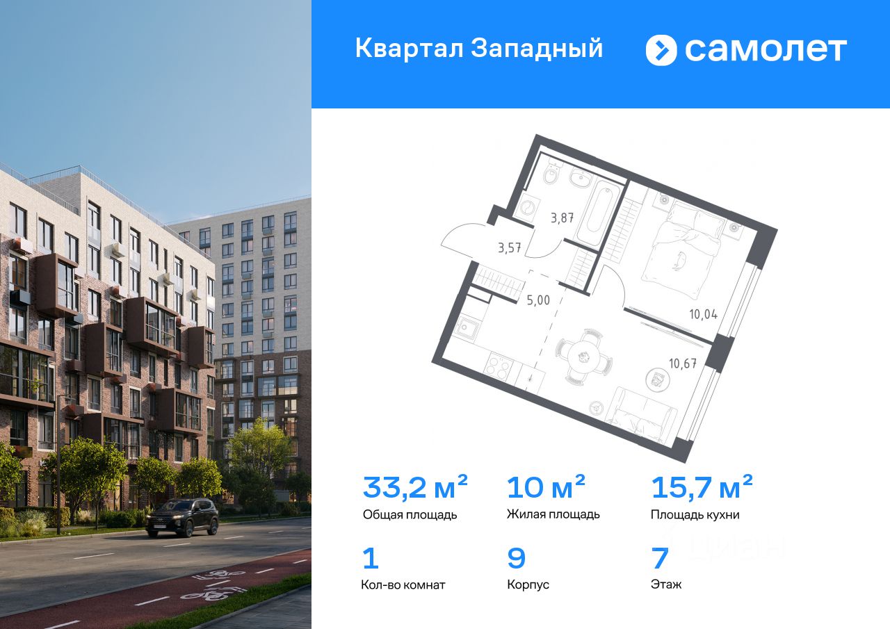 Предлагается 1-комнатная квартира комфорт-класса 33,15 кв.м в корпусе 9 на 7 этаже, в ЖК "Квартал Западный"