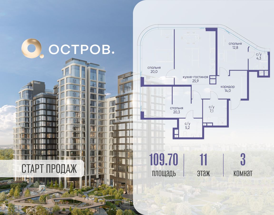Продаётся 3-комн. квартира от застройщика: общая площадь 109.70 м², жилая 53.10 м², кухня 25.90 м², 11-й этаж, жилой квартал "Остров 12", корпус 6 (секция 9). Срок сдачи: 1 квартал 2029 года.
