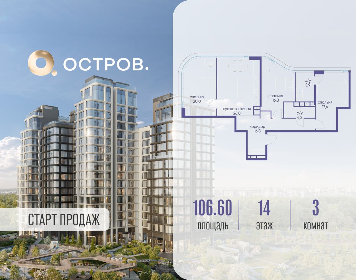 Продаётся 3-комн. квартира от застройщика: общая площадь 106.60 м², жилая 53.40 м², кухня 26.00 м², 14-й этаж, жилой квартал "Остров 12", корпус 6 (секция 9). Срок сдачи: 1 квартал 2029 года.