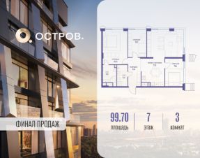 Продаётся 3-комн. квартира от застройщика: общая площадь 99.70 м², жилая 43.10 м², кухня 37.20 м², 7-й этаж, жилой квартал "Остров 12", корпус 2 (секция 1). Срок сдачи: 1 квартал 2029 года.