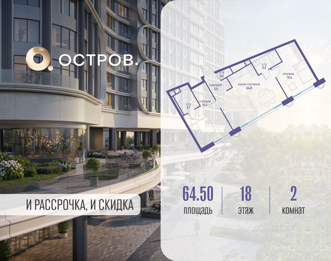 Продаётся двухкомнатная квартира от застройщика: общая площадь 64.50 м², жилая 28.80 м², кухня 24.80 м², 18, жилой квартал "Остров 7", корпус 7 (7 квартал) (секция 1). срок сдачи: 4-кв. 2025.