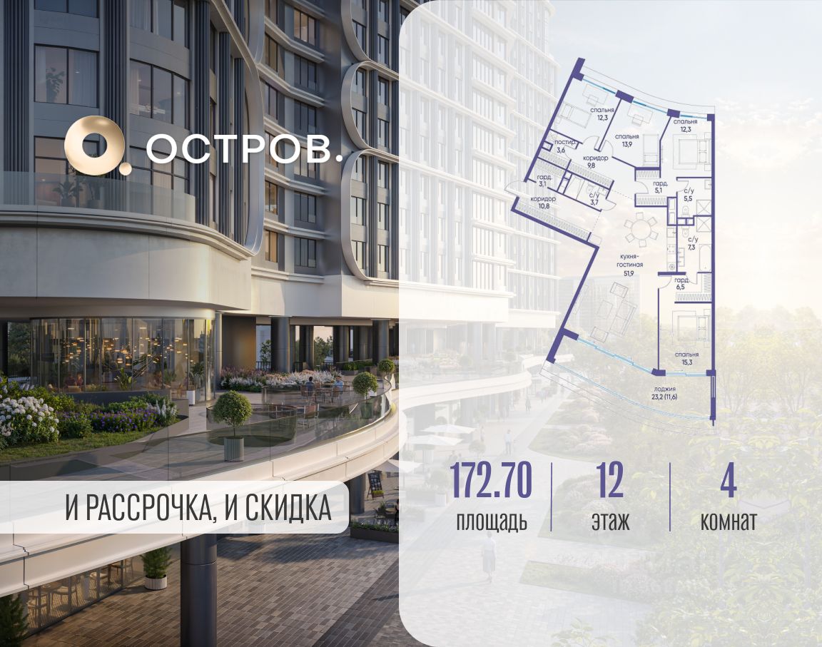 Продаётся четырехкомнатная квартира от застройщика: общая площадь 172.70 м², жилая 53.80 м², кухня 51.90 м², 12, жилой квартал "Остров 7", корпус 5 (7 квартал) (секция 2). срок сдачи: 4-кв. 2025.