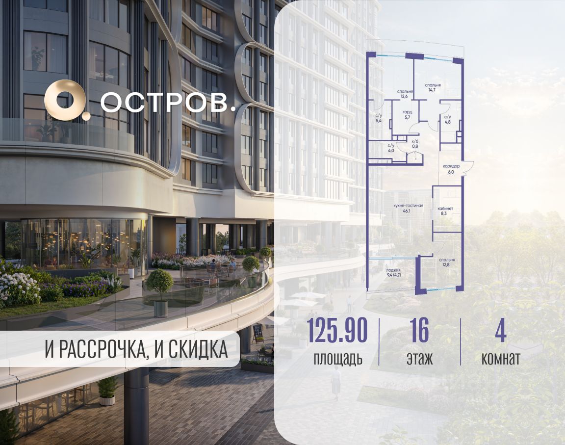 Продаётся четырехкомнатная квартира от застройщика: общая площадь 125.90 м², жилая 48.40 м², кухня 46.10 м², 16, жилой квартал "Остров 7", корпус 4 (7 квартал) (секция 1). срок сдачи: 4-кв. 2025.