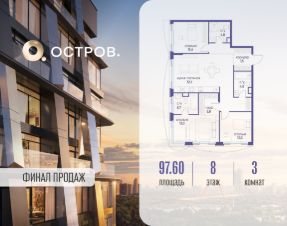 Продаётся 3-комн. квартира от застройщика: общая площадь 97.60 м², жилая 37.60 м², кухня 32.10 м², 8-й этаж, жилой квартал "Остров 12", корпус 4 (секция 1). Срок сдачи: 1 квартал 2029 года.