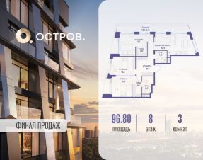 Продаётся трехкомнатная квартира от застройщика: общая площадь 96.80 м², жилая 38.60 м², кухня 20.50 м², 8, жилой квартал "Остров 12", корпус 1 (12.1 квартал) (секция 2). срок сдачи: 4-кв. 2025.